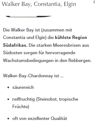 Link zum Anbaugebiet der Rebsorten: Pinotage (Stellenbosch) / Pinot Noir (Walker Bay)/ Merlot (Stellenbosch) / Cabernet Sauvignon (Stellenbosch) / Chenin Blanc (ganz Western Cape) / Chardonnay (Walker Bay, Konstantia, Elgin) / Sauvignon Blanc (Konstantia, Elgin)